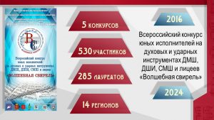 Всероссийский конкурс юных исполнителей на духовых и ударных инструментах ДМШ, ДШИ, СМШ и лицеев «ВОЛШЕБНАЯ СВИРЕЛЬ» проводится в ДШИ им. Г.Г. Галынина с 2016 года. За время проведения в конкурсе приняли участие 530 юных музыкантов из 14 регионов России и ближнего зарубежья. Создание условий и возможности всестороннего развития молодого поколения является одной из основных задач молодежной политики государства.